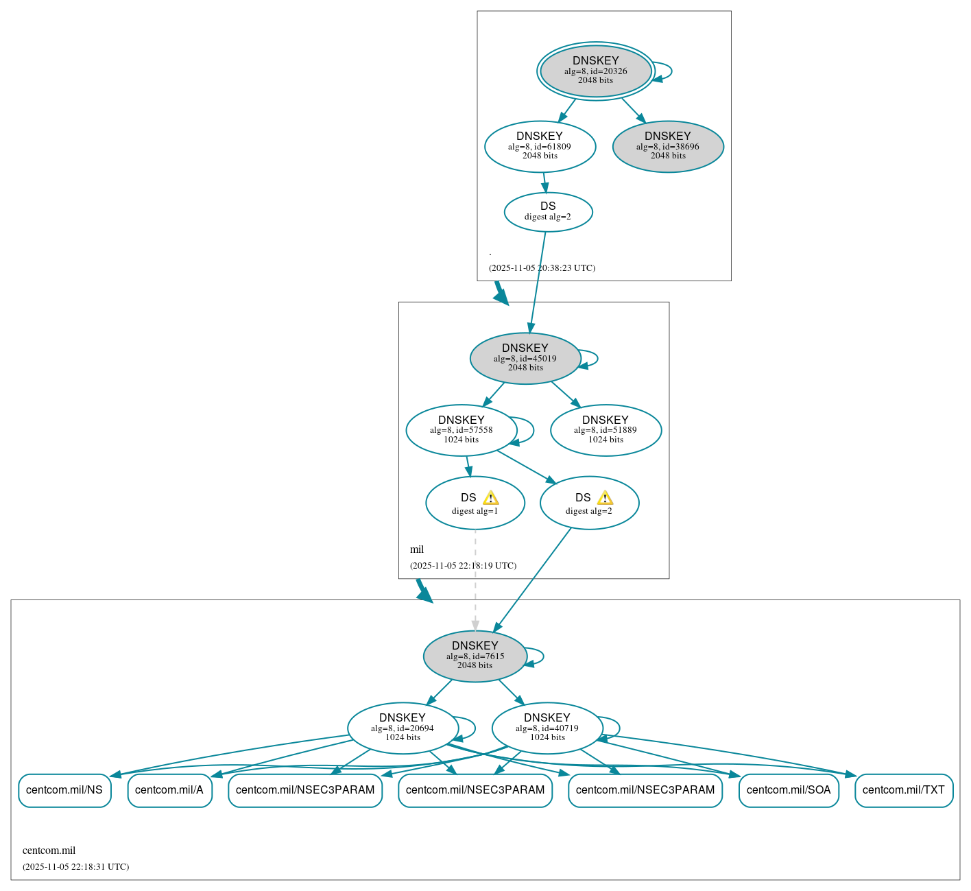 centcom.mil/DS (alg 8, id 7615): DNSSEC implementers are prohibited from implementing signing with DS algorithm 1 (SHA-1). See RFC 8624, Sec. 3.2.