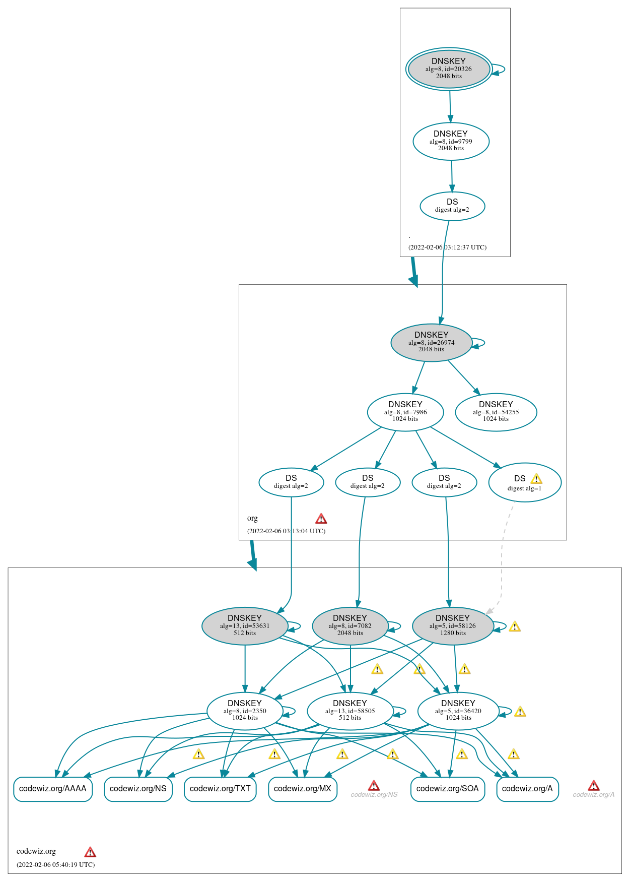 RRSIG codewiz.org/DNSKEY alg 5, id 58126: DNSSEC implementers are recommended against implementing signing with DNSSEC algorithm 5 (RSASHA1). See RFC 8624, Sec. 3.1.