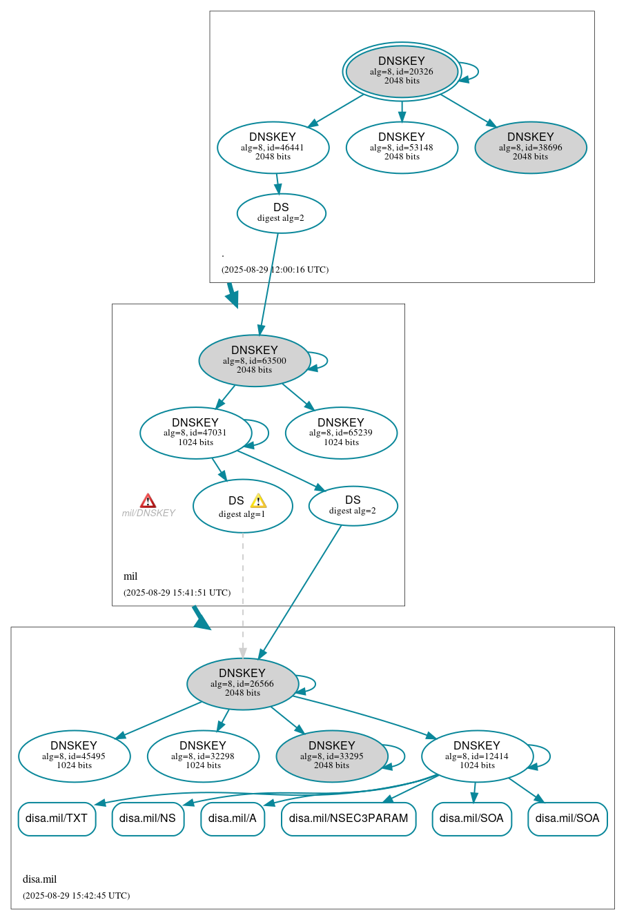 disa.mil/CNAME has errors; select the "Denial of existence" DNSSEC option to see them.