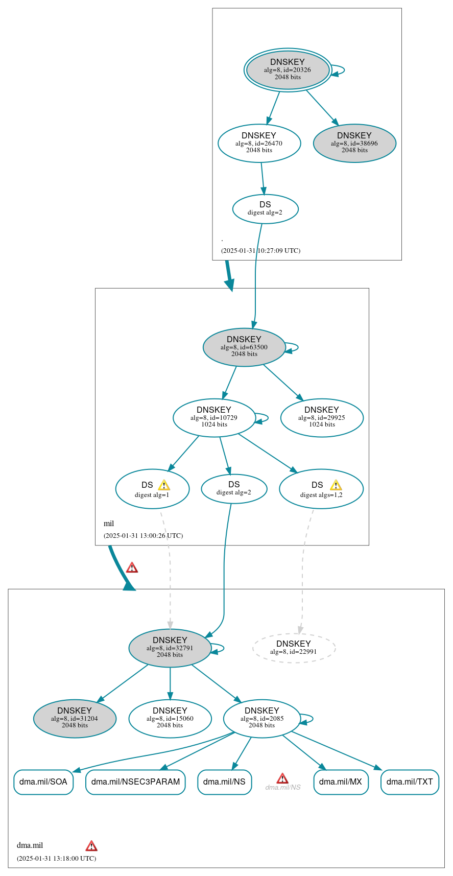 dma.mil/DS (alg 8, id 32791): DNSSEC implementers are prohibited from implementing signing with DS algorithm 1 (SHA-1). See RFC 8624, Sec. 3.2.