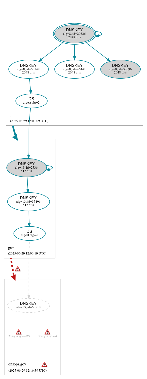 gov to dnsops.gov: No valid RRSIGs made by a key corresponding to a DS RR were found covering the DNSKEY RRset, resulting in no secure entry point (SEP) into the zone. See RFC 4035, Sec. 2.2, RFC 6840, Sec. 5.11.