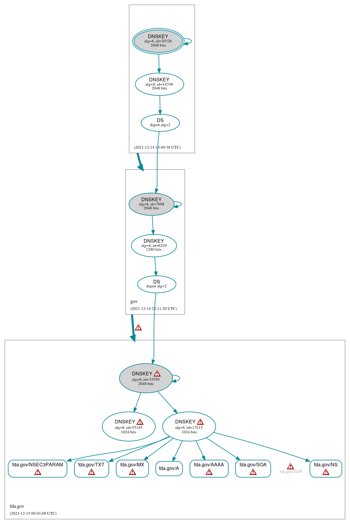 gov to fda.gov: No valid RRSIGs made by a key corresponding to a DS RR were found covering the DNSKEY RRset, resulting in no secure entry point (SEP) into the zone. See RFC 4035, Sec. 2.2, RFC 6840, Sec. 5.11. (2.22.230.64, 2600:1480:800::40, TCP_-_EDNS0_4096_)