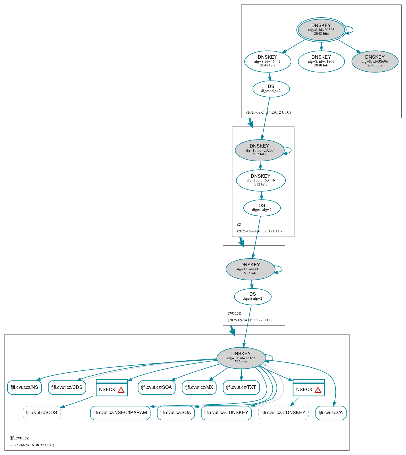 NSEC3 proving non-existence of fjfi.cvut.cz/CDS: The following queries resulted in an answer response, even though the bitmap in the NSEC3 RR indicates that the queried records don't exist: fjfi.cvut.cz/CDS, fjfi.cvut.cz/CDNSKEY See RFC 5155, Sec. 8.5.