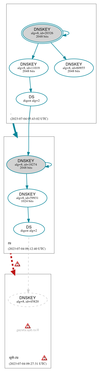 ru to spb.ru: No valid RRSIGs made by a key corresponding to a DS RR were found covering the DNSKEY RRset, resulting in no secure entry point (SEP) into the zone. See RFC 4035, Sec. 2.2, RFC 6840, Sec. 5.11.