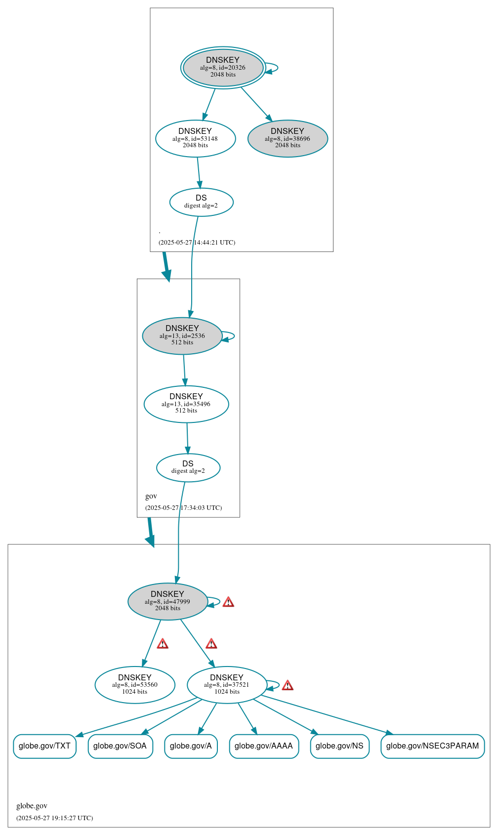 RRSIG globe.gov/DNSKEY alg 8, id 37521: With a TTL of 1296000 the RRSIG RR can be in the cache of a non-validating resolver until 1 day after it expires at 2025-06-10 01:22:23+00:00. See RFC 4035, Sec. 5.3.3.