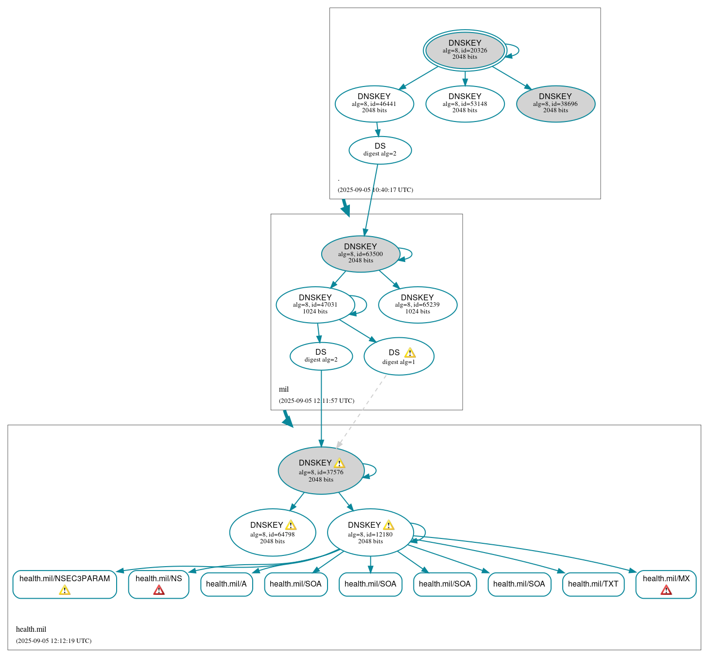 health.mil/DS (alg 8, id 37576): DNSSEC implementers are prohibited from implementing signing with DS algorithm 1 (SHA-1). See RFC 8624, Sec. 3.2.