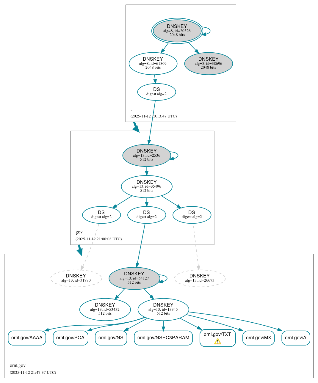 ornl.gov/TXT: No response was received until the UDP payload size was decreased, indicating that the server might be attempting to send a payload that exceeds the path maximum transmission unit (PMTU) size. See RFC 6891, Sec. 6.2.6. (2600:1480:f000::41, UDP_-_EDNS0_4096_D_KN)