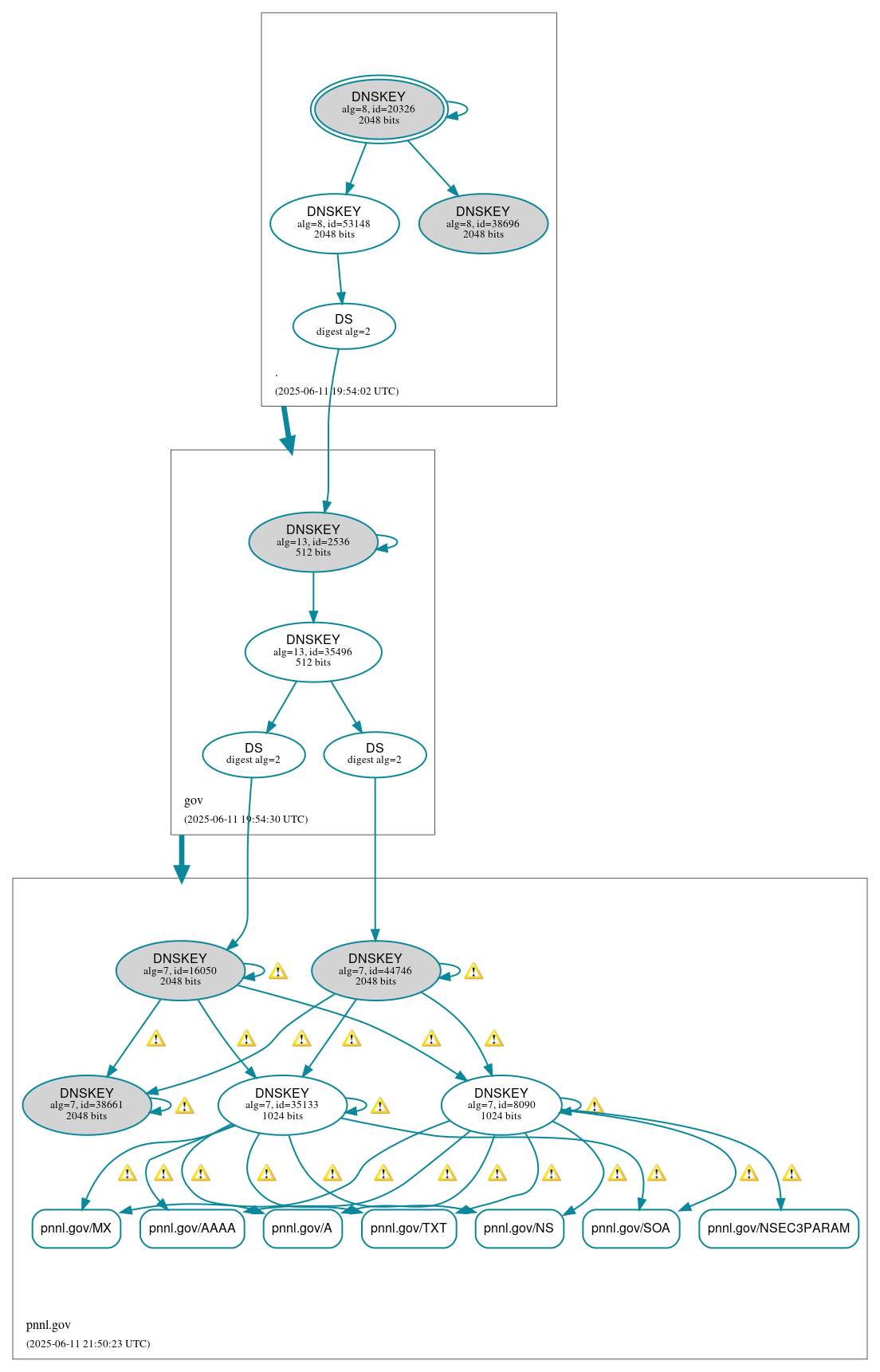 RRSIG pnnl.gov/NSEC3PARAM alg 7, id 8090: DNSSEC implementers are recommended against implementing signing with DNSSEC algorithm 7 (RSASHA1NSEC3SHA1). See RFC 8624, Sec. 3.1.