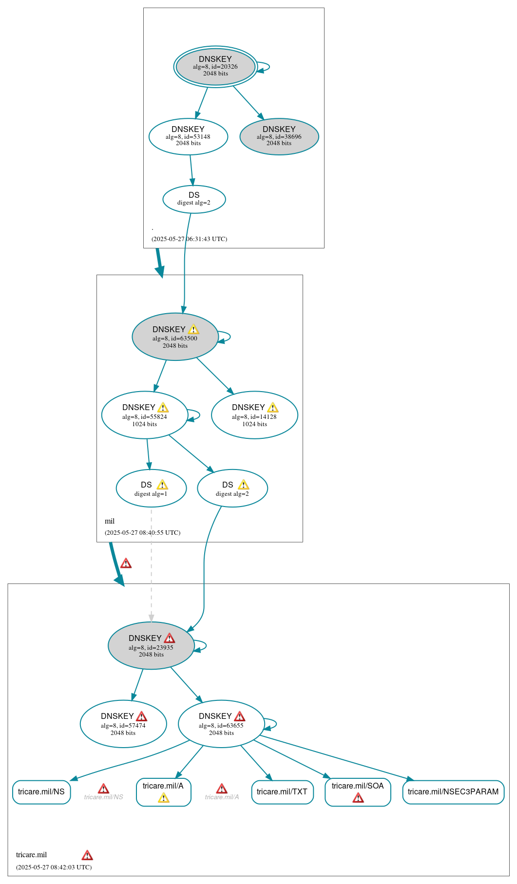 mil to tricare.mil: No valid RRSIGs made by a key corresponding to a DS RR were found covering the DNSKEY RRset, resulting in no secure entry point (SEP) into the zone. See RFC 4035, Sec. 2.2, RFC 6840, Sec. 5.11. (214.2.209.178, 214.2.211.178, 214.2.213.178, 214.2.216.178, UDP_-_EDNS0_4096_D_KN)