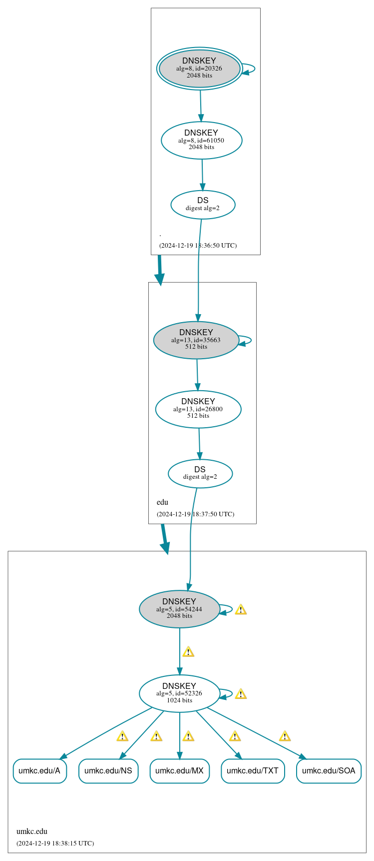 umkc.edu/DNSKEY has warnings; select the "Denial of existence" DNSSEC option to see them.