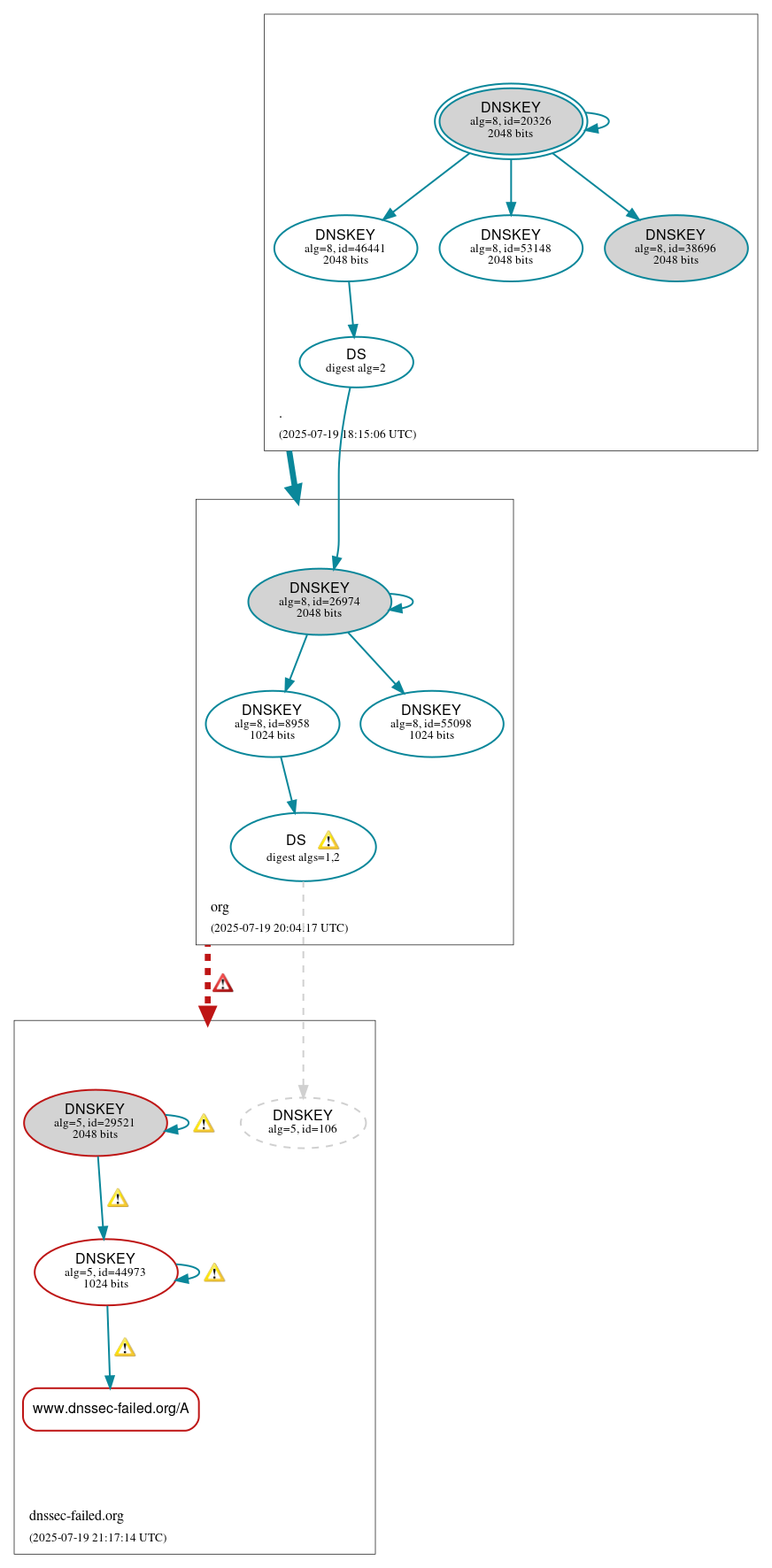 • org to dnssec-failed.org: The DS RRset for the zone included algorithm 5 (RSASHA1), but no DS RR matched a DNSKEY with algorithm 5 that signs the zone's DNSKEY RRset. See RFC 4035, Sec. 2.2, RFC 6840, Sec. 5.11. (68.87.68.244, 68.87.72.244, 68.87.76.228, 68.87.85.132, 69.252.250.103, 2001:558:1004:7:68:87:85:132, 2001:558:100a:5:68:87:68:244, 2001:558:100e:5:68:87:72:244, 2001:558:1014:c:68:87:76:228, 2001:558:fe23:8:69:252:250:103, UDP_-_EDNS0_4096_D_KN)