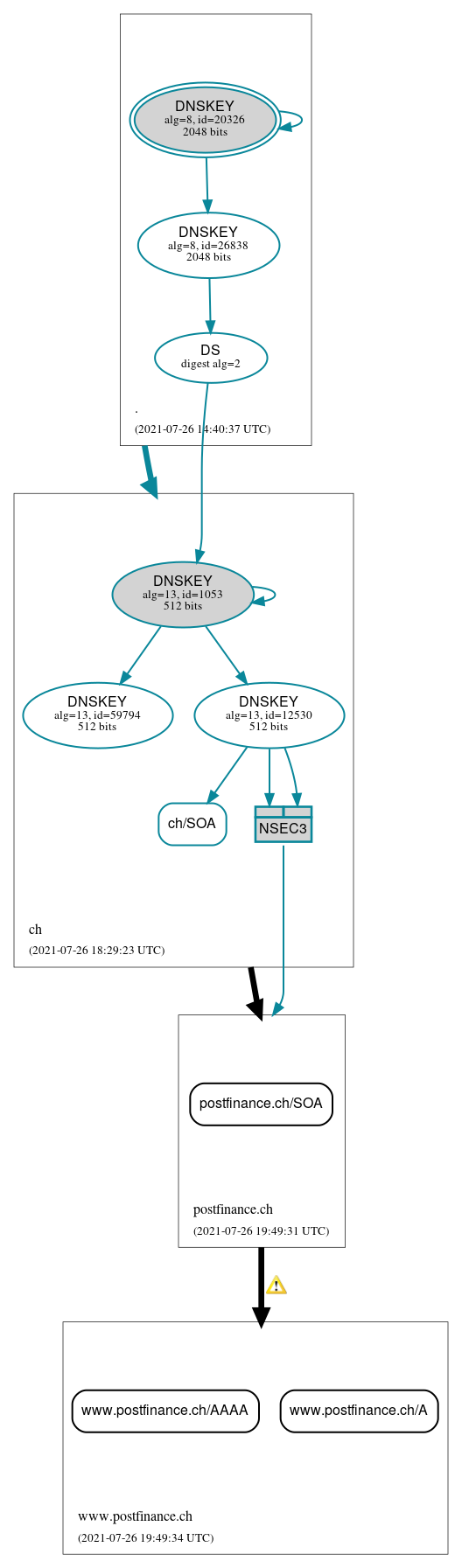 www.postfinance.ch/CNAME has errors; select the "Denial of existence" DNSSEC option to see them.
