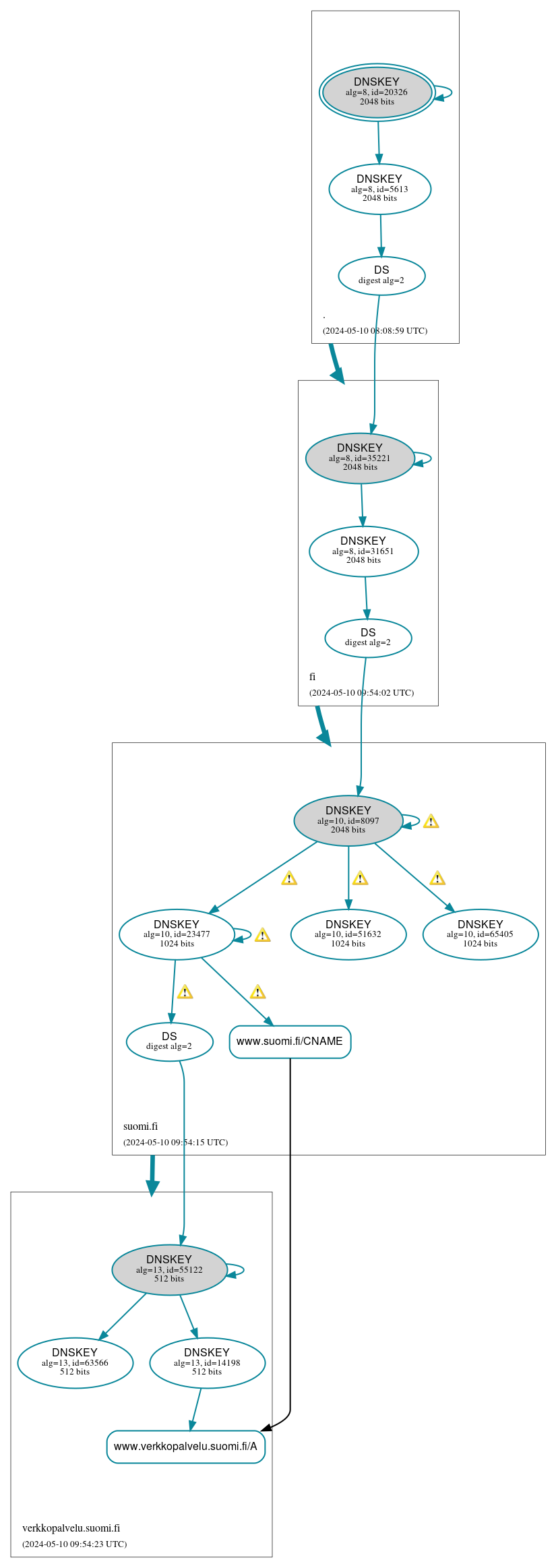 suomi.fi/CNAME has errors; select the "Denial of existence" DNSSEC option to see them.