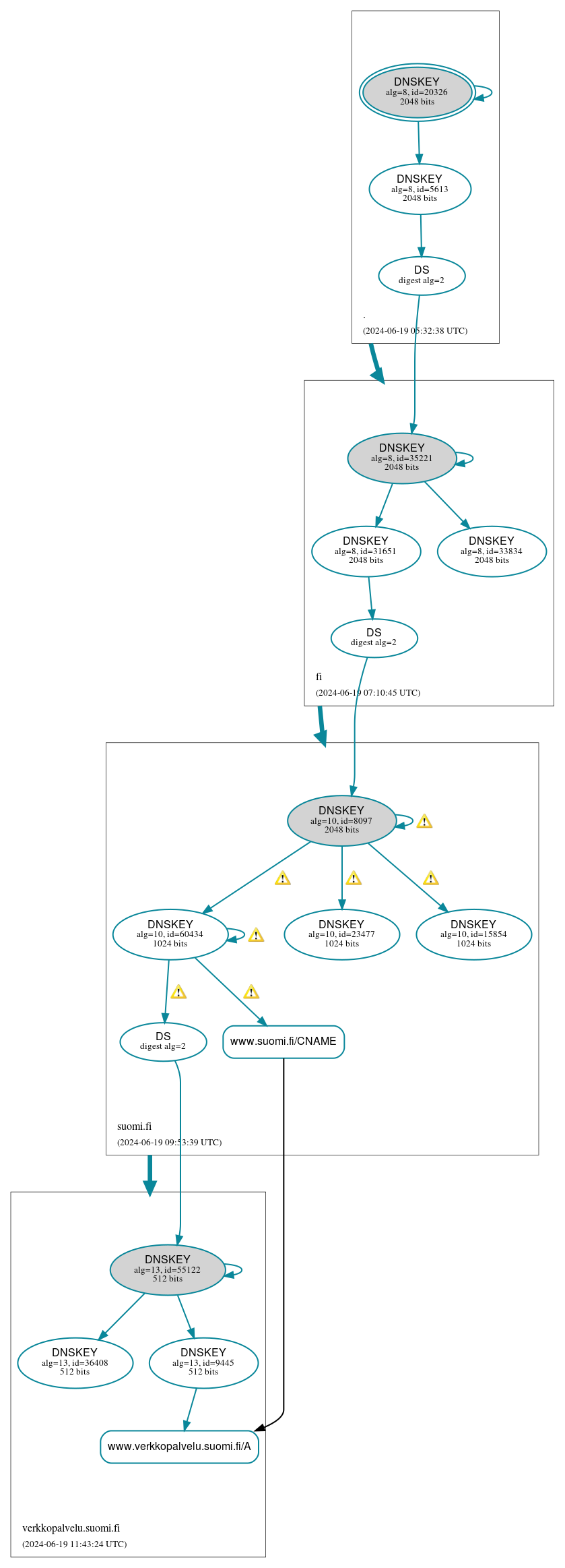 RRSIG verkkopalvelu.suomi.fi/DS alg 10, id 60434: DNSSEC implementers are recommended against implementing signing with DNSSEC algorithm 10 (RSASHA512). See RFC 8624, Sec. 3.1.