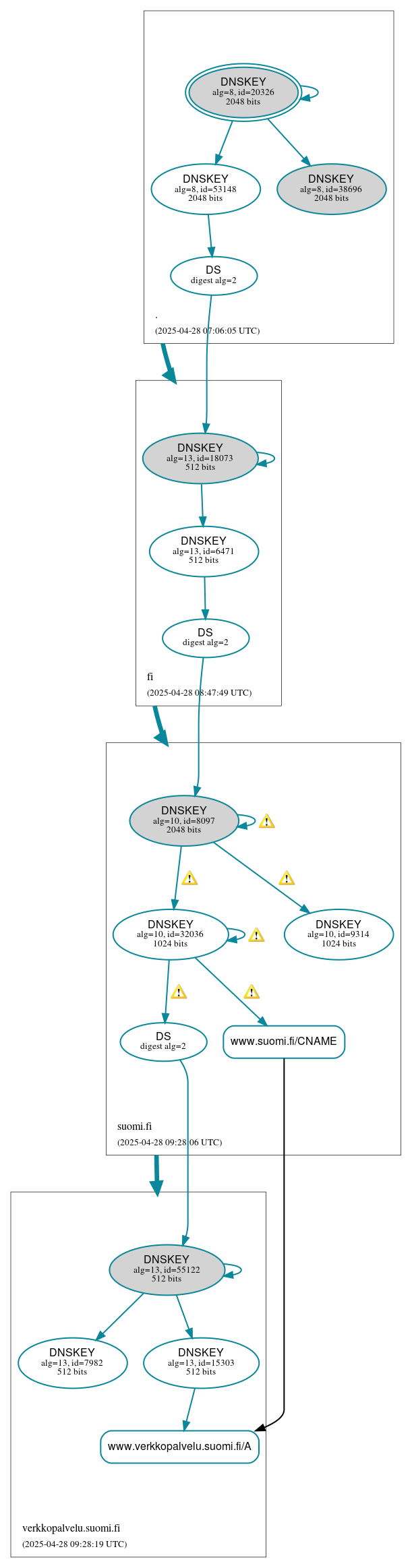 suomi.fi/CNAME has errors; select the "Denial of existence" DNSSEC option to see them.