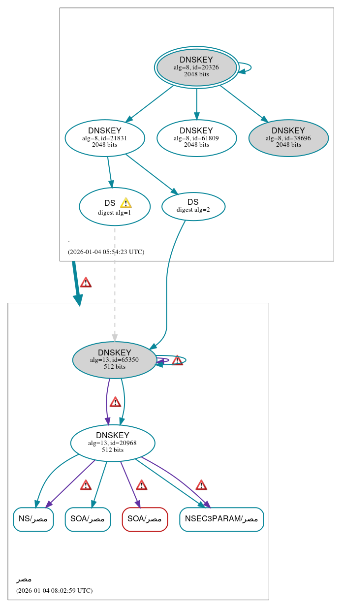 . to مصر: No valid RRSIGs made by a key corresponding to a DS RR were found covering the DNSKEY RRset, resulting in no secure entry point (SEP) into the zone. See RFC 4035, Sec. 2.2, RFC 6840, Sec. 5.11. (204.61.216.106, UDP_-_EDNS0_4096_D_KN, UDP_-_EDNS0_512_D_KN)